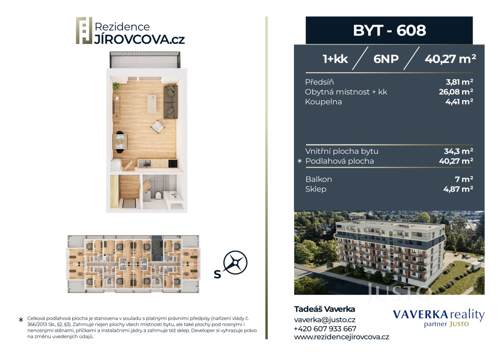 Tento byt číslo 608, o dispozici 1+kk se nachází v 6. nadzemním podlaží.