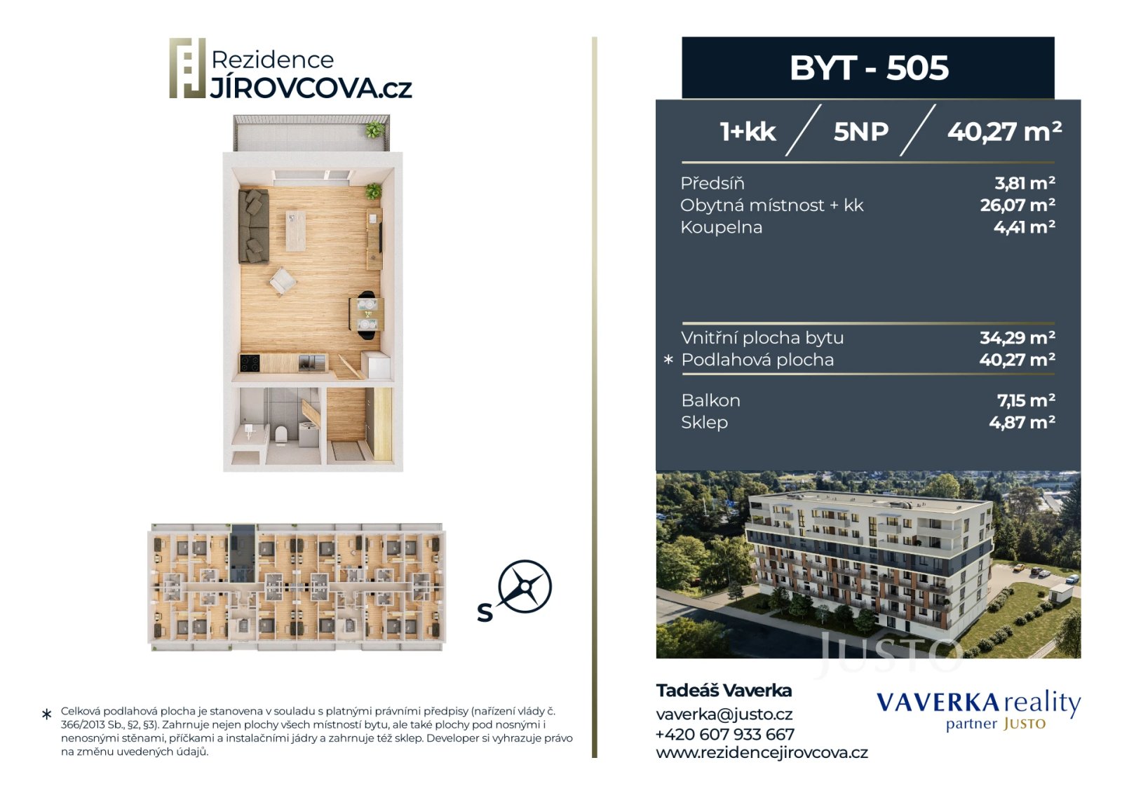 Tento byt číslo 505, o dispozici 1+kk se nachází v 5. nadzemním podlaží.