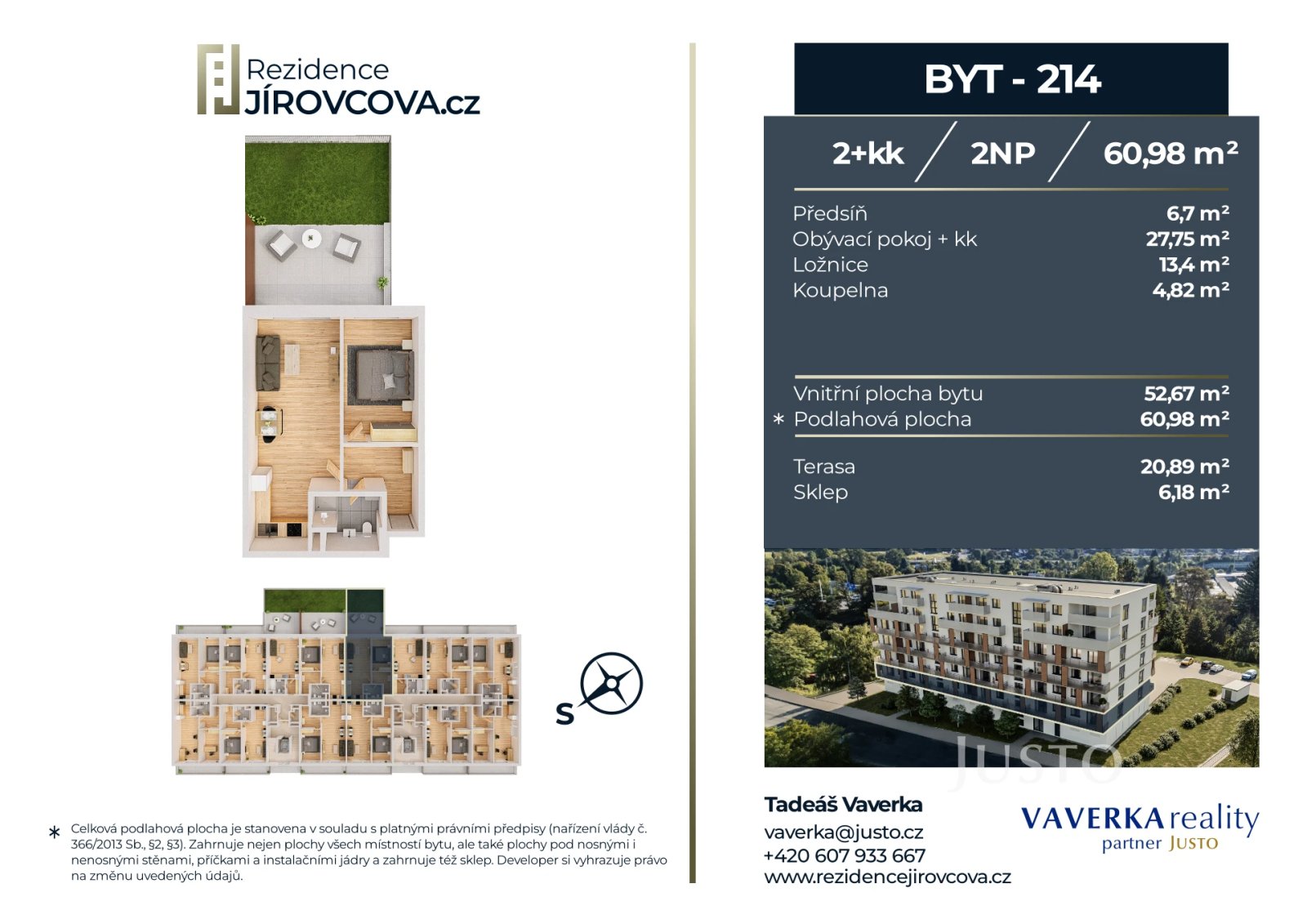 Podlahová plocha bytu včetně sklepu (plocha bytu včetně vnitřních příček a sklepu, který je součástí bytu, dle vyhlášky č. 366/2013, §2 a §3) je 60,98 m2.